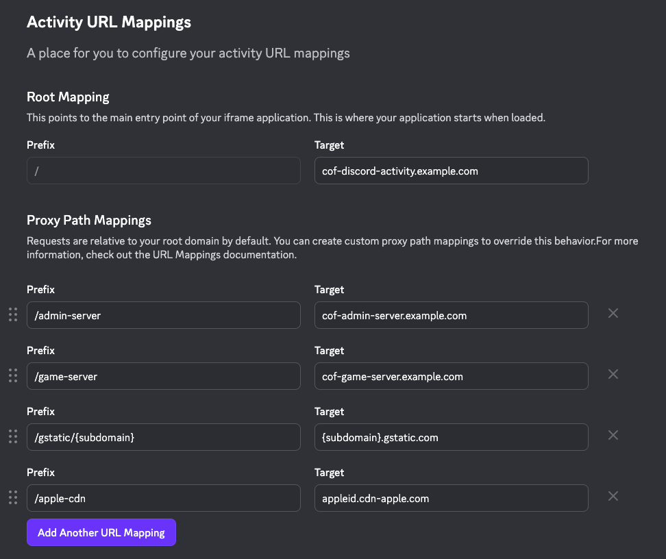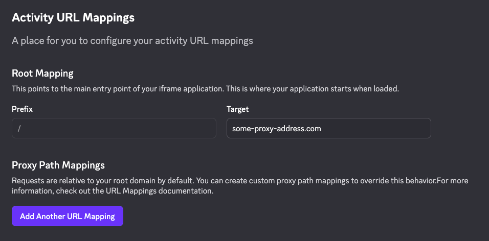 Your Activity is loaded inside an iframe pointing to https://<your-client-id>.discordsays.com. In the previous section, we said that the example app was running locally and we didn't have to upload anything. Rather, we had to expose the locally running server via a Cloudflare tunnel and make our activity's root mapping point to that local development server. If the tunnel name Cloudflare gave us is some-tunnel-address.com, we have to enter exactly that in the URL Mappings section of our activity's settings: